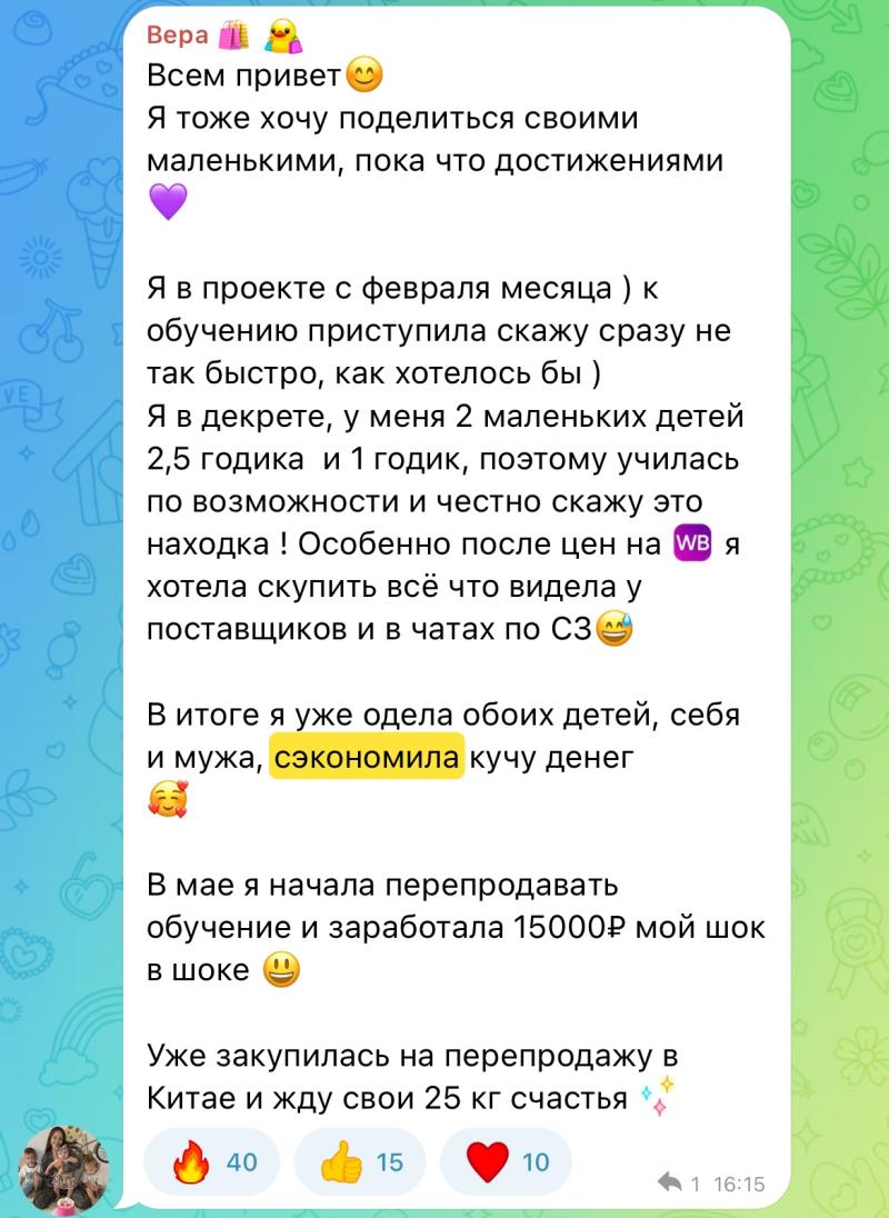 Научу тебя, как: находить проверенных поставщиков без посредников, экономить до 90% на каждой покупке, и при желании зарабатывать на перепродаже.Это не сетевой и не волшебная кнопка просто пошаговая система, которая работает. 25 000+ учеников уже пользуются этим и экономят каждый день!